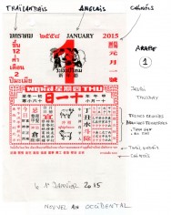 Sur plusieurs feuilles de ce document sont écrit les traductions des mots utiles. De page en page le lecteur apprend à comprendre les informations utiles et sur chacune des autres pages il reconnaît la notion nouvelle. Chaque page une notion, et ainsi en quelques pages tout découvrir de la richesse de ce calendrier. Une approche didactique. Des textes additionnels donnent les premiers éléments qui expliquent le calendrier chinois.